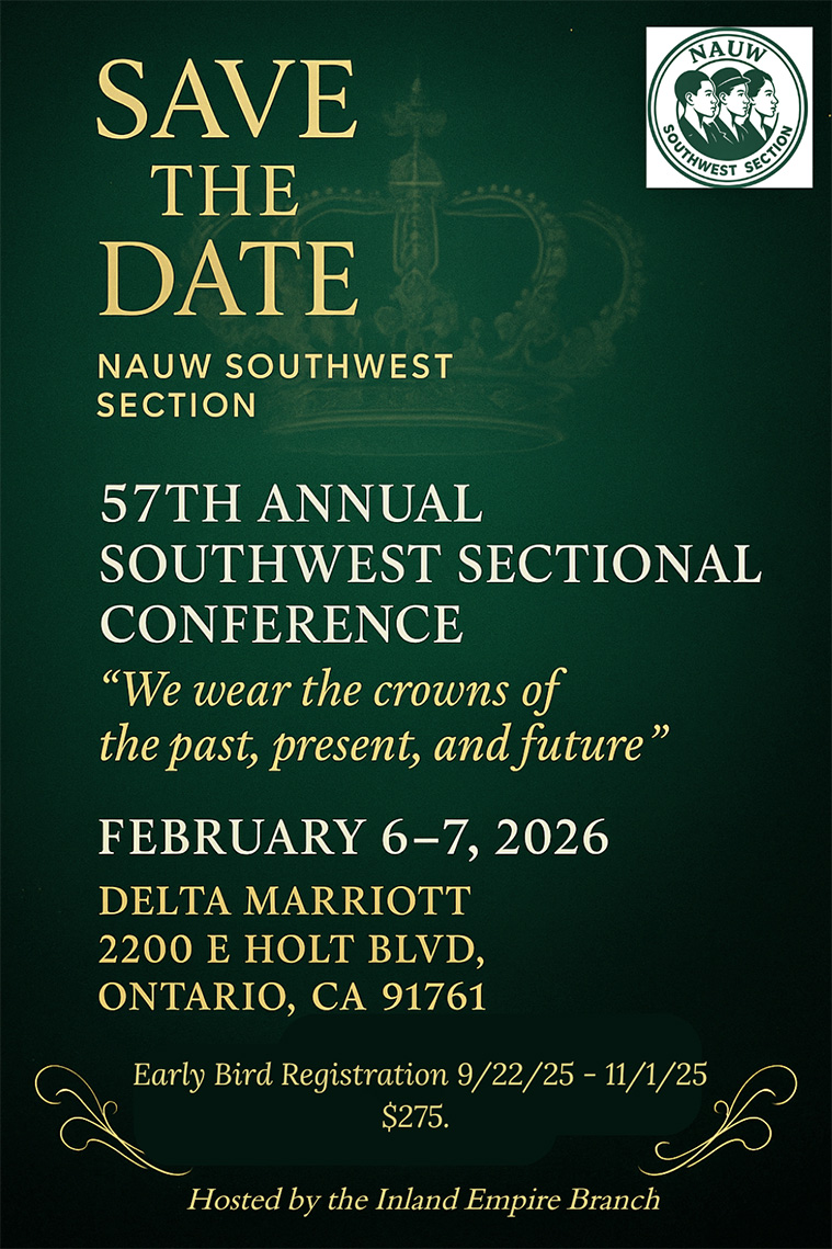 As the Southwest Section moved forward with having all of its ten branches now incorporated and moving toward being tax exempted in the State of California. As the Southwest Section Director I moved with vision and core purpose in making the Southwest Section strong in the dreams of our founders in leadership, services, and personal development as NAUW continues to make a positive impact on communities and educational standards. We take on the vision of our founder, in playing a vital role in this mission. May God continue to shine His face on the Southwest Section. Amen.